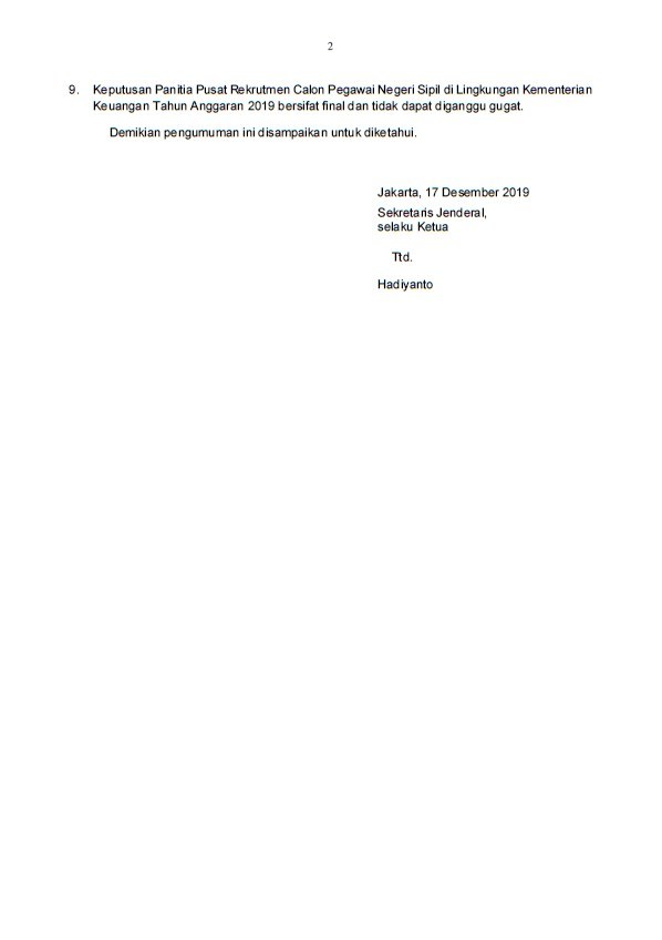 - Keputusan Panitia Pusat Rekrutmen Calon Pegawai Negeri Sipil di Lingkungan Kementerian Keuangan Tahun Anggaran 2019 bersifat final dan tidak dapat diganggu gugat.